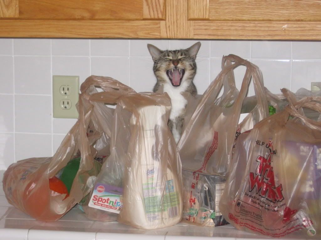 I got back from the market yesterday and put the groceries on the counter. Within 2 seconds Noodle had positioned herself behind the grocery bags and was "singing". Yes, we were out of cat food so I guess she was a little bit hungry! I just thought the picture came out so cute and had to post it.