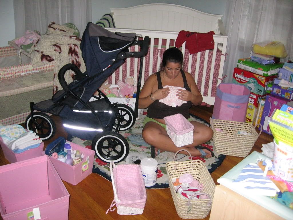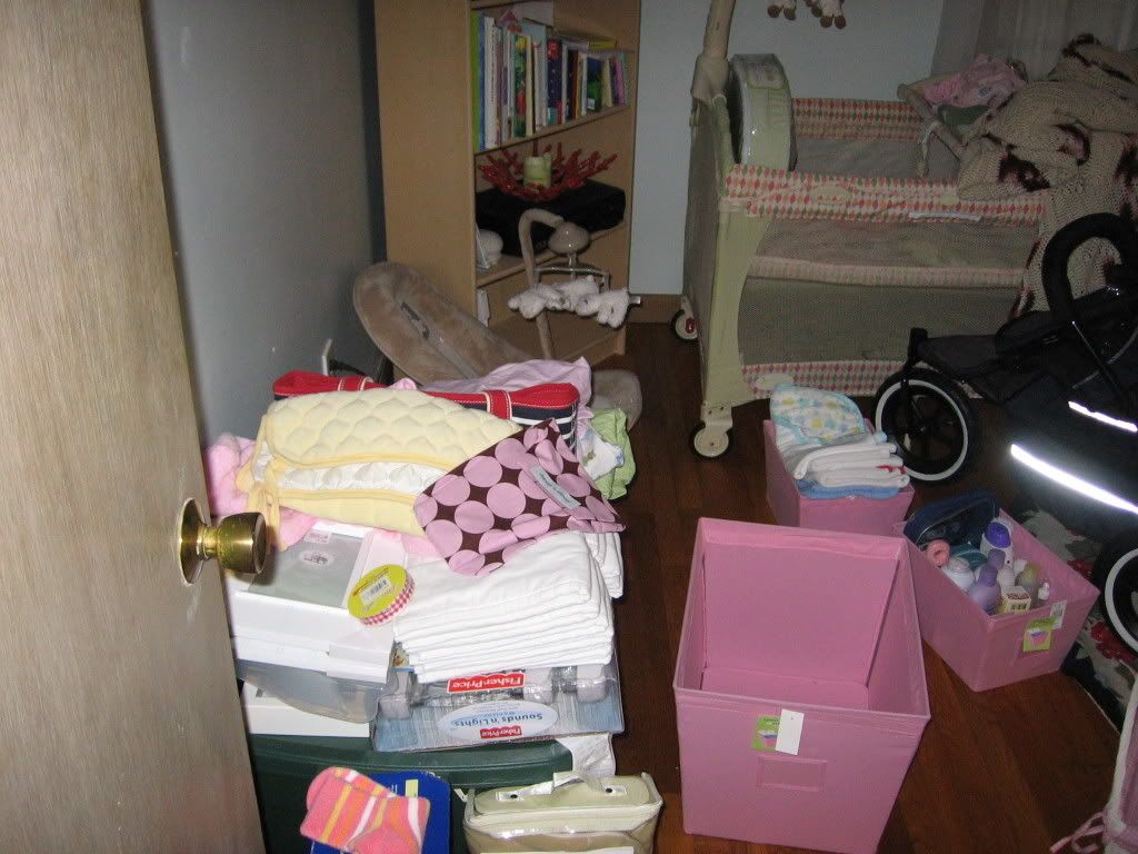 Since the last nursey update I have kept the door to that room closed. It was just too overwhelming for me to even think about. Well, I took a deep breath and opened the door today...How can such a tiny little person require so much stuff? Anyway, we got a lot accomplished but I didn't take an "after" picture since we still have more to do. Today I just conquered the closet so that everything had a place (at least for now). I am waiting for orders from Target and the Container Store to come so I can organize the dresser. Rob is working on putting the finishing touches on the dresser and we need to pick up a bookshelf from my mom's. Then we should be in pretty good shape. After the nursery is done I will move onto making room in the bathroom closet for her "toiletries" and then the kitchen to make room for baby food, bottles, etc. I stocked up on baby food 2 weeks ago when Target put out a coupon for $1 off 2 Gerber baby foods. Their jars of food cost $.52 each so if you do the math that comes out to $.02 per jar of food. When I say that I stocked up I really mean it! I printed the coupons off the computer and I think that I ended up using a total of 40 coupons. I did buy a lot of organic food so that was a little bit more expensive but still a great deal! If anyone wants a link to the coupon let me know and I can e-mail it to you. It expires on 8/15 so there is not much time left.