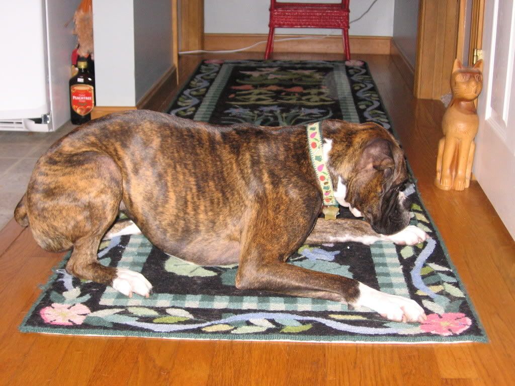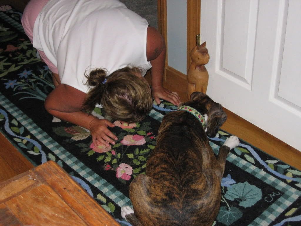 Lily desperately trying to hunt my mom's cats in the basement. She stayed in this position for most of the night. Every once in a while you would see a little paw shoot out from under the door. I think that Hula was trying to get Lily's nose.
