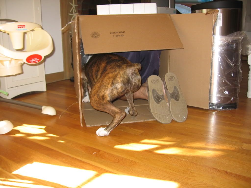 Rob and Lily inspecting the box that our new garbage can came in. When did garbage cans become so expensive by the way? This one was $100...are you kidding me? It is only an 8 gallon can. We are returning it because even with a gift card I just cannot justify that!
